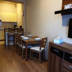 Obývačka s rozkladacím gaučom a LCD TV je prepojená s kuchynským kútom s jedálenským sedením, keramickou varnou doskou, chladničkou s mrazničkou, mikrovlnkou, kávovarom a hriankovačom.