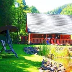 V exteriéri vás čaká terasa so sedením, ktorá je zastrešená. V letných mesiacoch si tu môžete grilovať, opekať a variť guláš. Súčasťou je záhradná hojdačka pri jazierku so pstruhmi. Deti čaká detské ihrisko vybavené trampolínou a hojdačkou. Parkovanie vozidiel je možné pri chate.