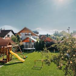 Exteriér tvorí terasa s vonkajším sedením, grilom, kotlíkom a krytý altánok so sedením. Pre deti je pripravené ihrisko s domčekom so šmykľavkou, pieskoviskom, trampolínou či hojdačkami. Zabaviť sa môžete hraním stolného tenisu a futbalu, bedmintonu či futbalu na upravenej záhrade. Lyže a bicykle si môžete odložiť v lyžiarni. Pri dome je 5 parkovacích miest. Akákoľvek hudba v exteriéri je zakázaná počas celého dňa.
