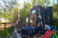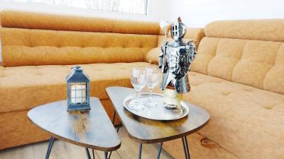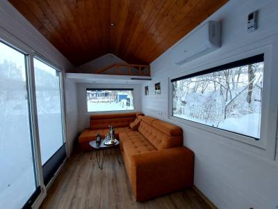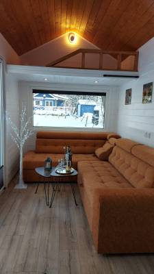 Domček je vybavený obývačkou s rozkladacím gaučom, TV a rádiom.