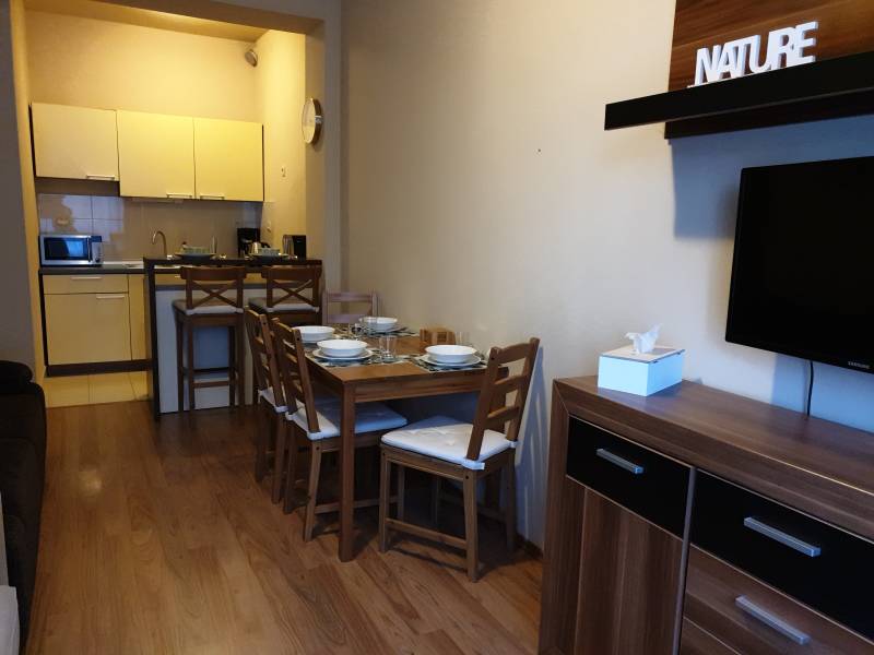 Obývačka s rozkladacím gaučom a LCD TV je prepojená s kuchynským kútom s jedálenským sedením, keramickou varnou doskou, chladničkou s mrazničkou, mikrovlnkou, kávovarom a hriankovačom.