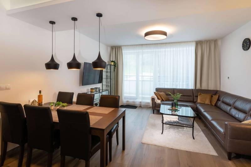 Ubytovanie v 4-izbovom moderne zariadenom apartmáne s 3 spálňami je vhodné pre 10 osôb. Obývacia izba, z ktorej je vstup na terasu, ponúka útulný krb a pohodlné sedenie, ako aj Smart TV so streamovacou službou Netflix. Kuchyňa s jedálenským sedením je nadštandardne vybavená. Apartmán sa môže pochváliť tromi spálňami s priestrannými posteľami a Smart TV. Pre rodiny s malými deťmi je k dispozícii detská postieľka, vysoká stolička a nočník. Súčasťou je kúpeľňa so sprchovacím kútom, práčkou, WC a samostatná toaleta. Pre pohodlie hostí je v celom apartmáne dostupné wifi pripojenie na internet.