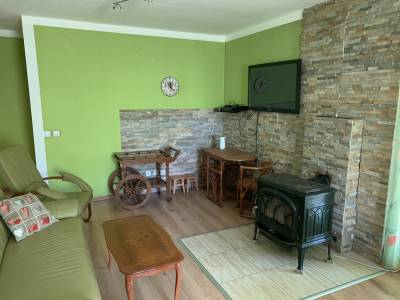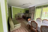 Kuchynská časť plynulo prechádza do jedálne a obývacej izby, kde si môžete vychutnať spoločné chvíle pri stole, oddychovať na pohodlnom gauči alebo si dopriať večerný film. Televízor s výberom rôznych kanálov zabezpečí zábavu pre všetky vekové kategórie.