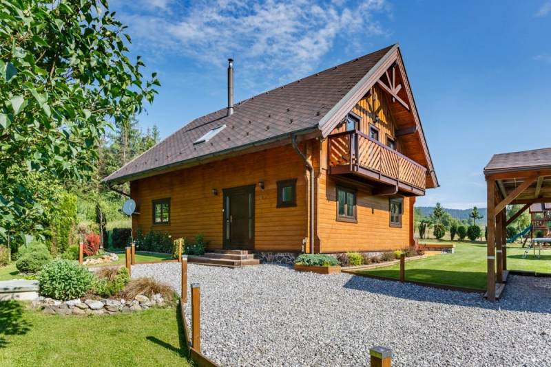Exteriér disponuje terasou so sedením, záhradnou hojdačkou, ležadlami a plynovým grilom. Rodiny s deťmi ocenia detské ihrisko s dreveným domčekom, šmykľavku, hojdačku či trampolínu. K dispozícii je aj miestnosť na uskladnenie lyží a bicyklov. Parkovanie je možné pred objektom.