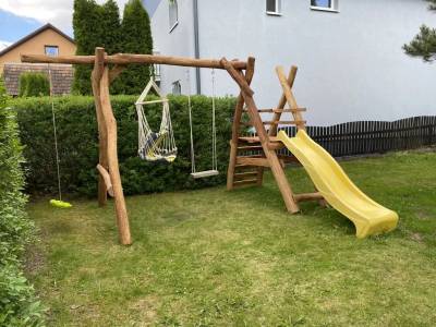 V exteriéri je pre deti pripravené pieskovisko, hojdačky a šmykľavka. Altánok ponúka sedenie, záhradnú hojdačku, krb s grilom, kotlík a ohnisko. Vedľa chalupy sa nachádza penzión s reštauráciou, kde si môžete objednať raňajky, večeru alebo polpenziu. Za poplatok je možnosť zapožičania bicyklov. Pri chalupe sa nachádza parkovisko pre 2 vozidlá.
