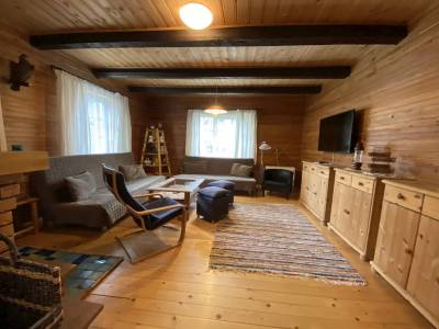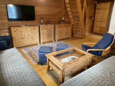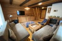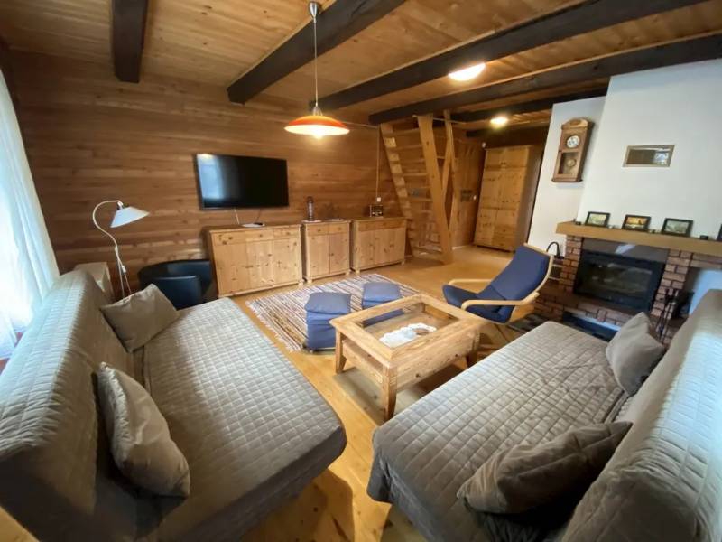 Interiér chalupy zahŕňa obývaciu izbu s rozkladacím gaučom, na ktorom sa vyspia 2 osoby, kreslá, LCD TV so satelitom, murovaný krb, rádio a spoločenské hry.