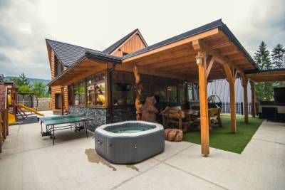 V exteriéri si posedíte na terase a v altánku so sedením, grilom, krbom, kotlíkom a ohniskom. Pre deti je pripravený detský kútik s hračkami a ihrisko s pieskoviskom, hojdačkou, preliezkami, trampolínou a šmykľavkou. Tí väčší sa zabavia pri hraní stolného futbalu, stolného tenisu a air hockey. Parkovanie pre 6 áut je možné na oplotenom parkovisku pri chate.