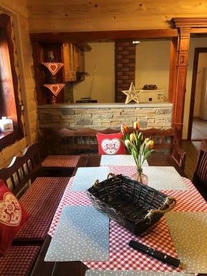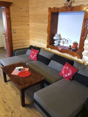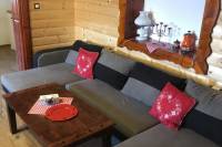 Drevenica má obývaciu izbu s gaučovým sedením, jedálenským sedením, rádiom a TV.