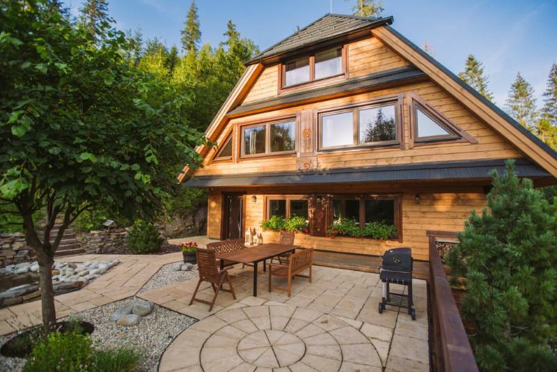 Exteriér tvorí terasa s výhľadom na vrchy Belianskych Tatier Havran a Ždiarsku vidlu. Disponuje vonkajším sedením, ležadlami, grilom, kotlíkom a ohniskom. Priamo pri chalete je 5 parkovacích miest, kde nájdete aj wallbox nabíjačku pre nabíjanie elektromobilu.