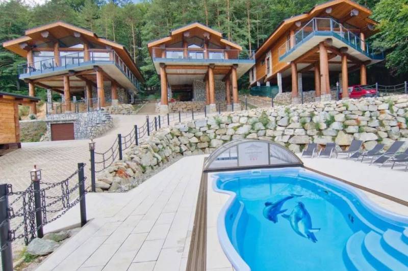 V exteriéri môžete využiť súkromnú terasu s vírivkou a grilom. Využiť môžete aj spoločnú wellness zónu so saunou a vonkajším bazénom. Vonku sa nachádza altánok s vonkajším sedením, grilom a ohniskom. Pre deti je nachystané ihrisko s pieskoviskom, hojdačkou, preliezkami, šmykľavkou a trampolínou. Zašportovať sa dá aj na spoločnom volejbalovom ihrisku v areáli. Parkovanie je dostupné pri ubytovaní.